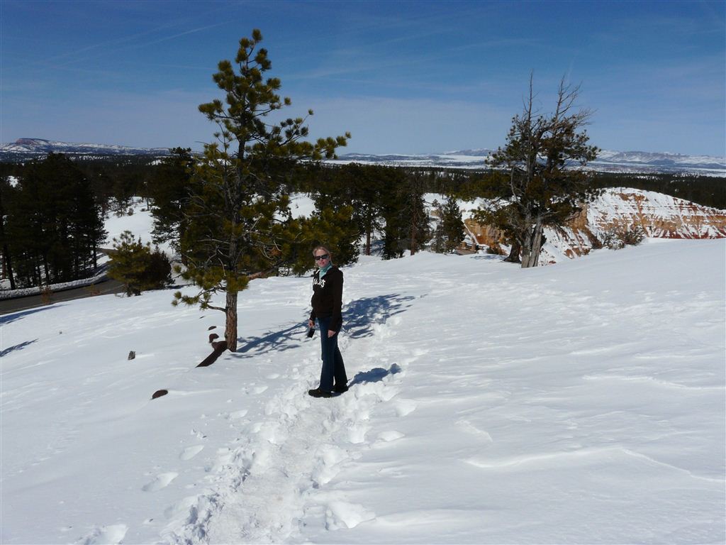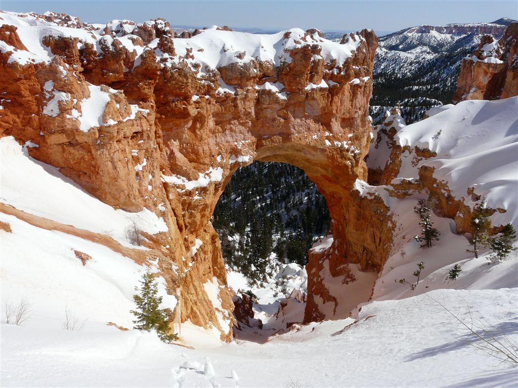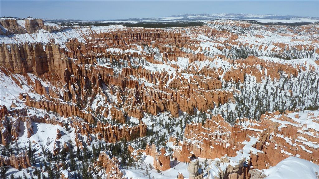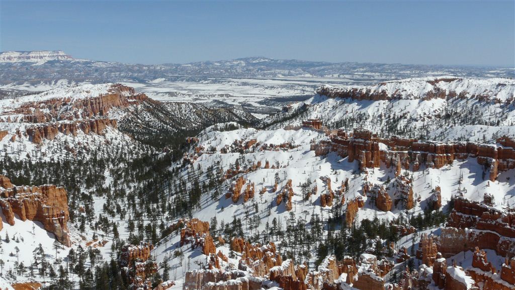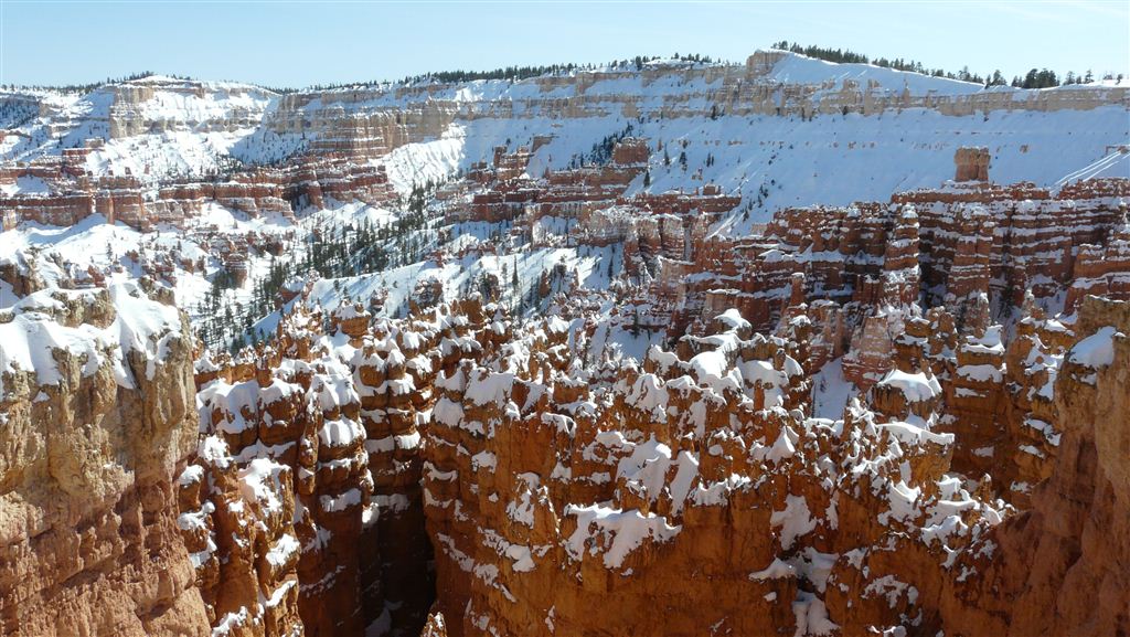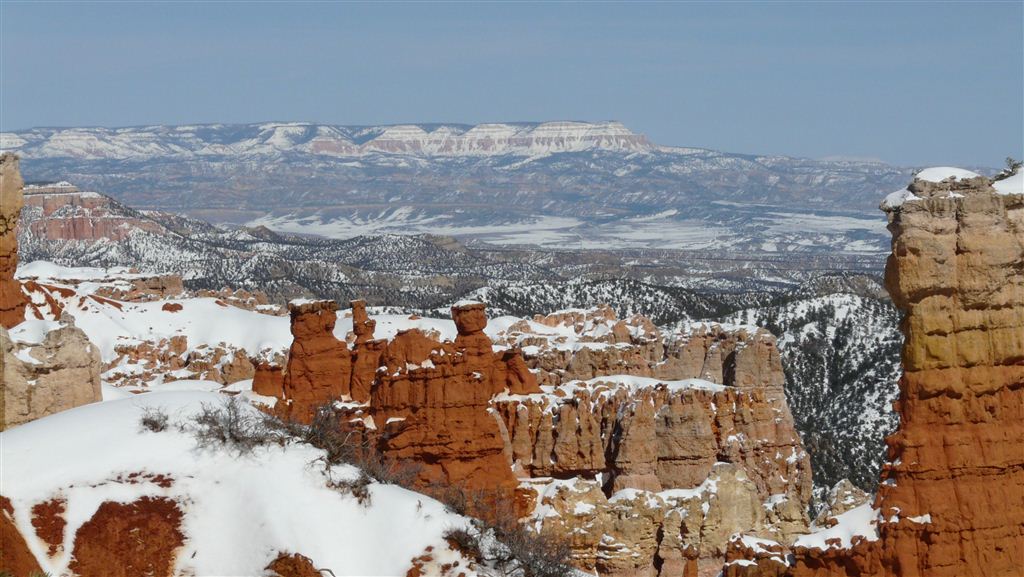 13. März 2010Der Bryce Canyon ist klein, aber eindrücklich. Auf 2000 bis 3000 Meter gelegen, präsentiert er sich zurzeit ziemlich winterlich. Bis auf wenige Aussichtspunkte war aber die Hauptstrasse durch den Park geöffnet. Die Ausblicke mit den teils schneebedeckten Felsen waren ganz besonders. Der Himmel war strahlend blau und die Temperaturen um den Gefrierpunkt.
