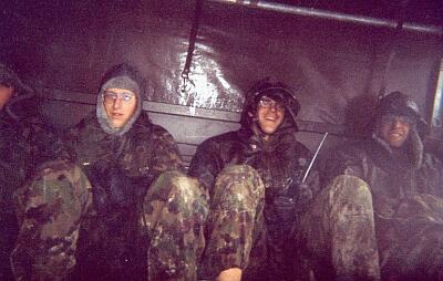 Verschiebung* nach der DHU in einem Armeelastwagen* * Verschiebung = Transport aller Soldaten zur letzten Phase der RS von Thusis nach S-Chanf * Armeelastwagen = nicht wasserdichtes und relativ kühles Transportmittel Hi Dominik! Tja dieses Bild MUSS einfach kommentiert werden. Finde den Gegensatz der Gesichter von Jörg (von Kälte und Nässe gezeichnet) und Häusler (lachend als wäre er auf dem Weg in die Ferien) einfach sensationell!