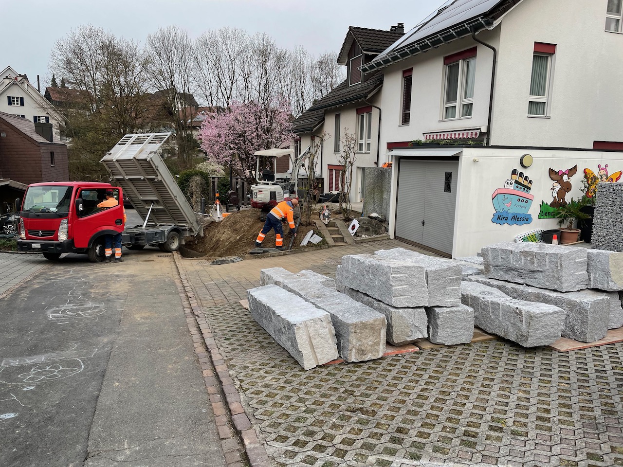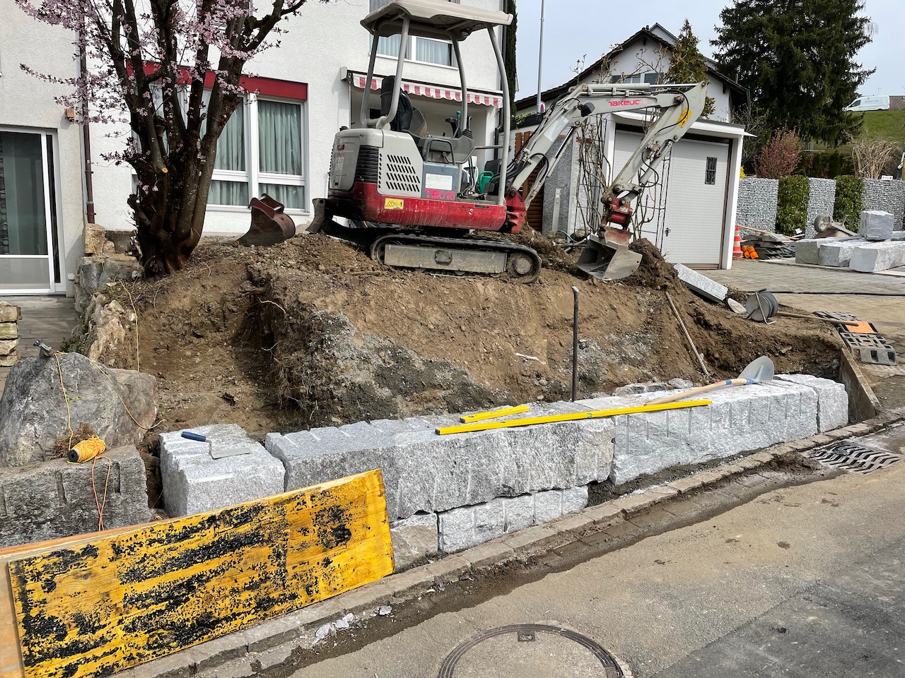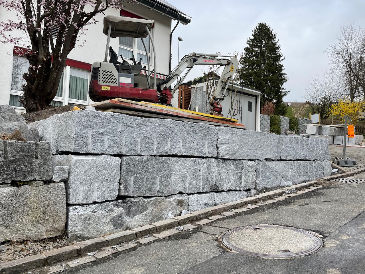 Am 29. März wurden die grossen die Quader Tessiner Granit geliefert und auch die neuen Stellen. Mit einem Greifbagger wurden diese innert zwei Tagen verlegt.