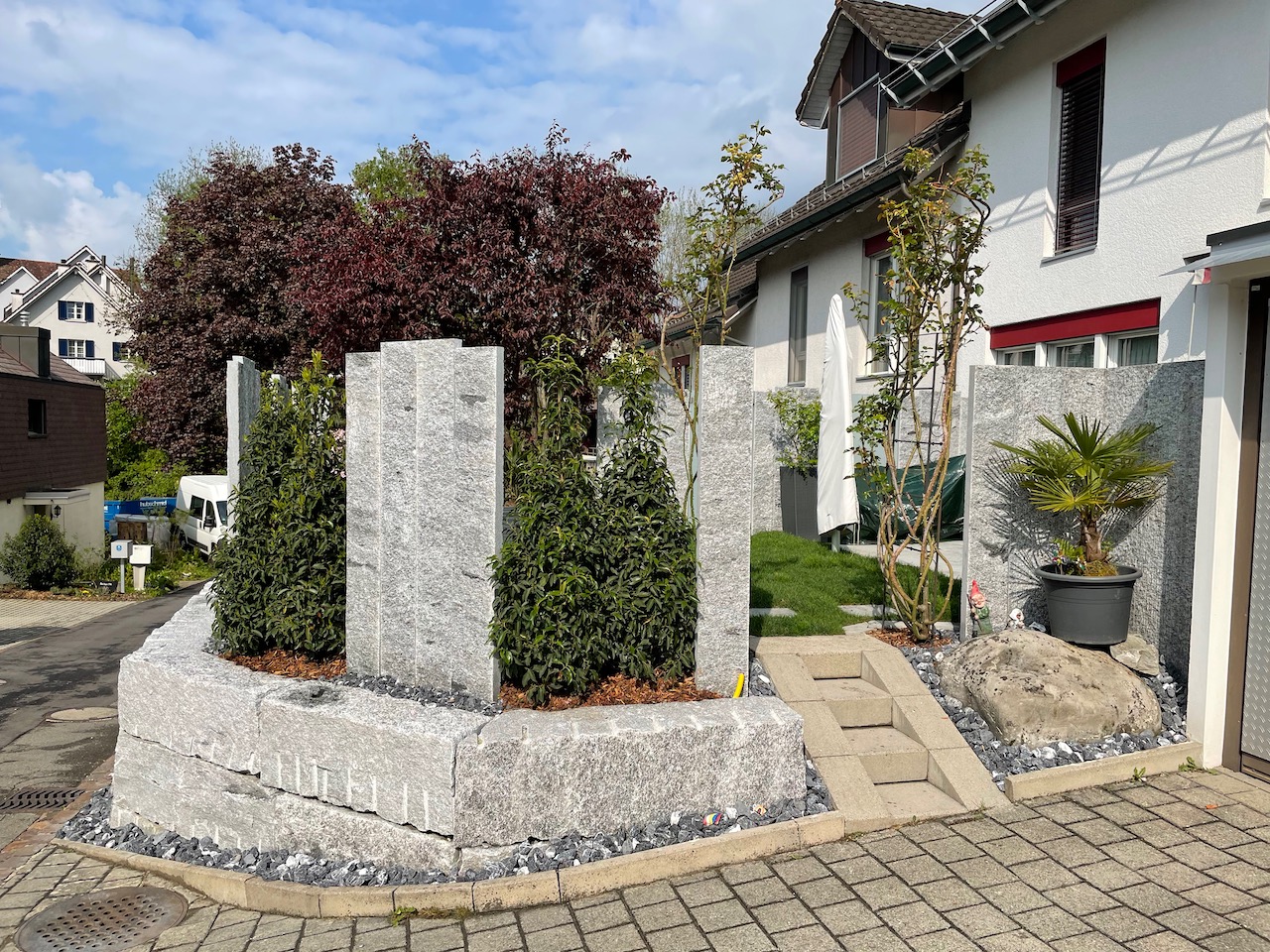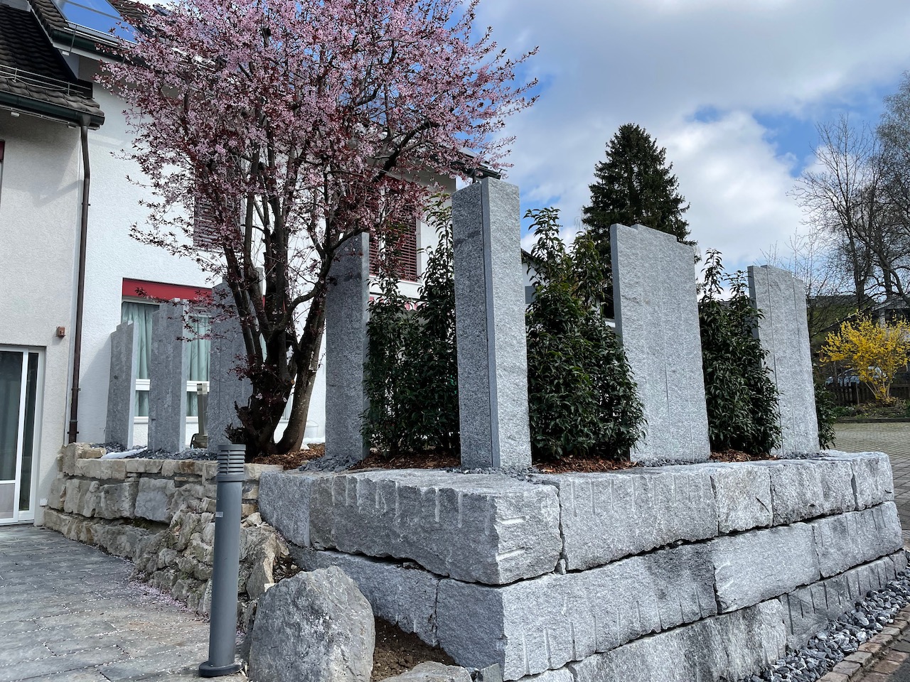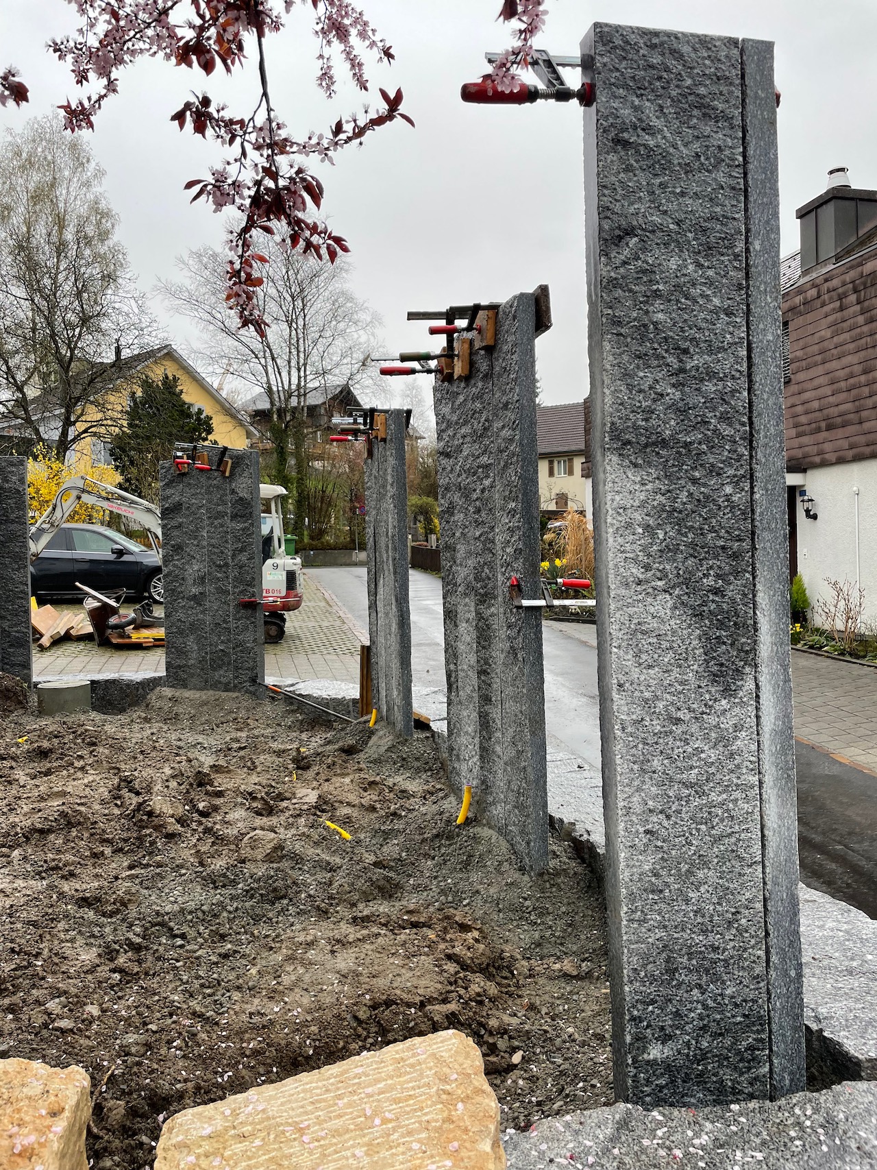 Am 29. März wurden die grossen die Quader Tessiner Granit geliefert und auch die neuen Stellen. Mit einem Greifbagger wurden diese innert zwei Tagen verlegt.