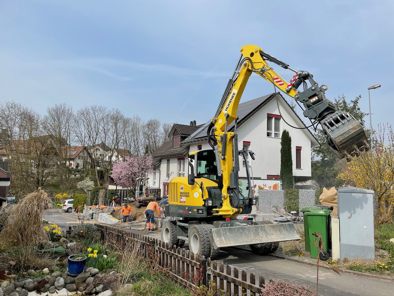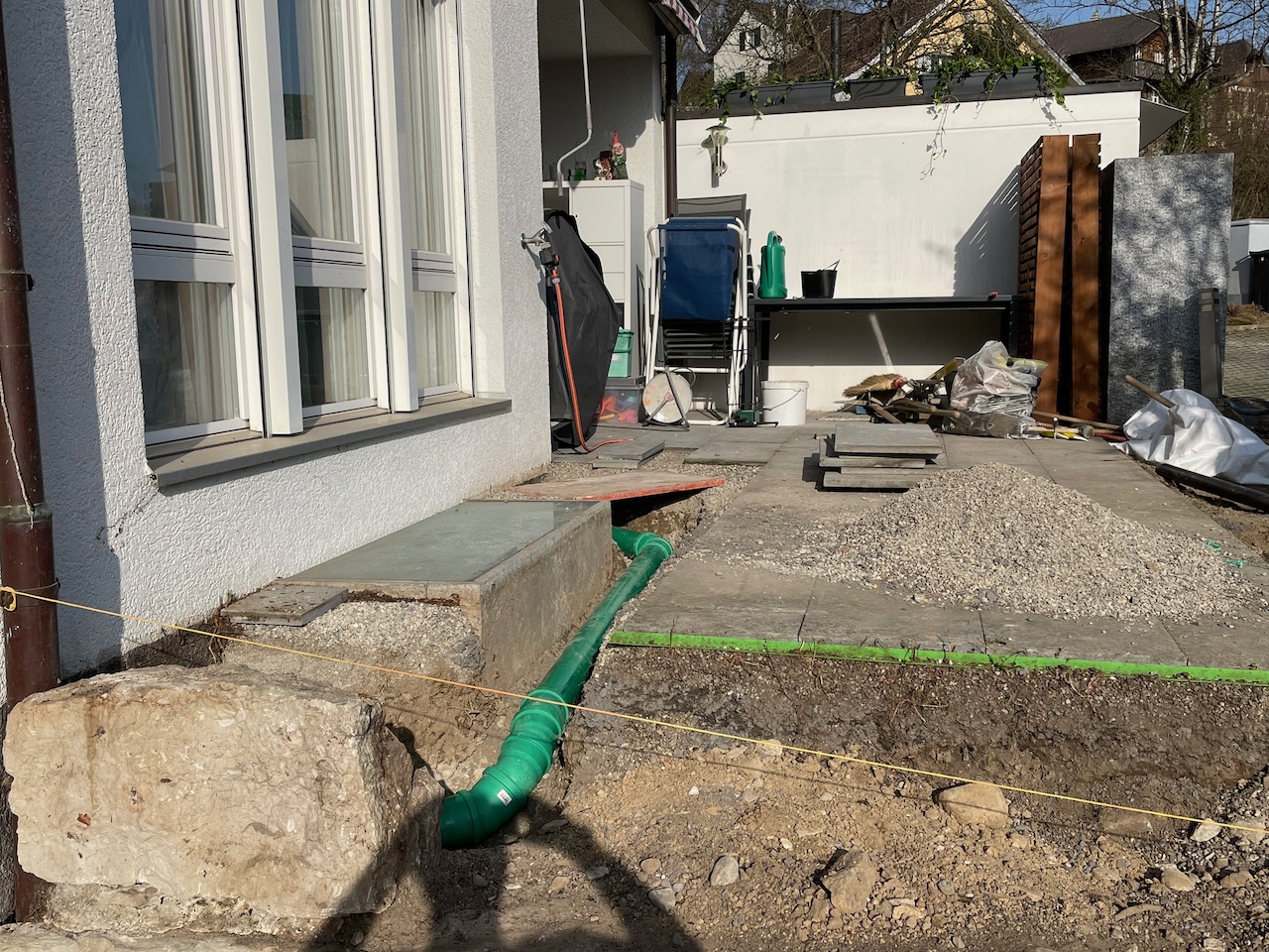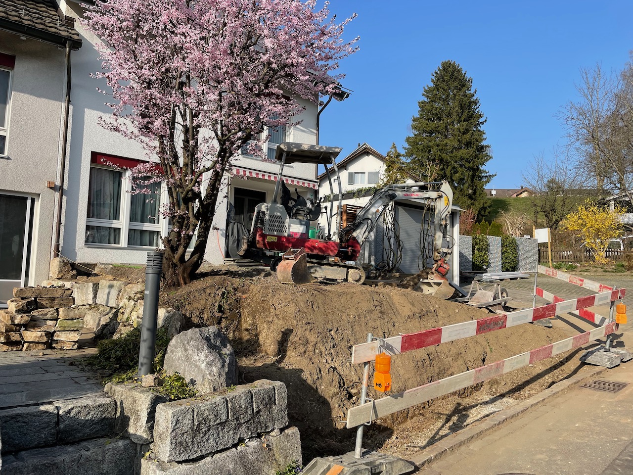 Am Montag, 28. März startete der Umbau. Innert einem Morgen war ziemlich alles weg. Als erstes wurde nun die neue Abwasserleitung verlegt und wieder zu gedeckt.