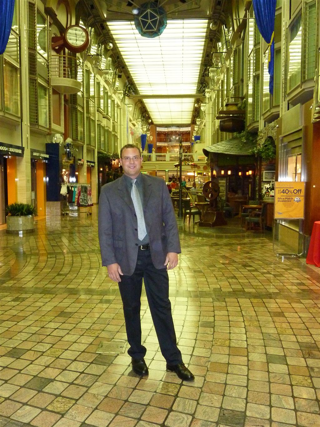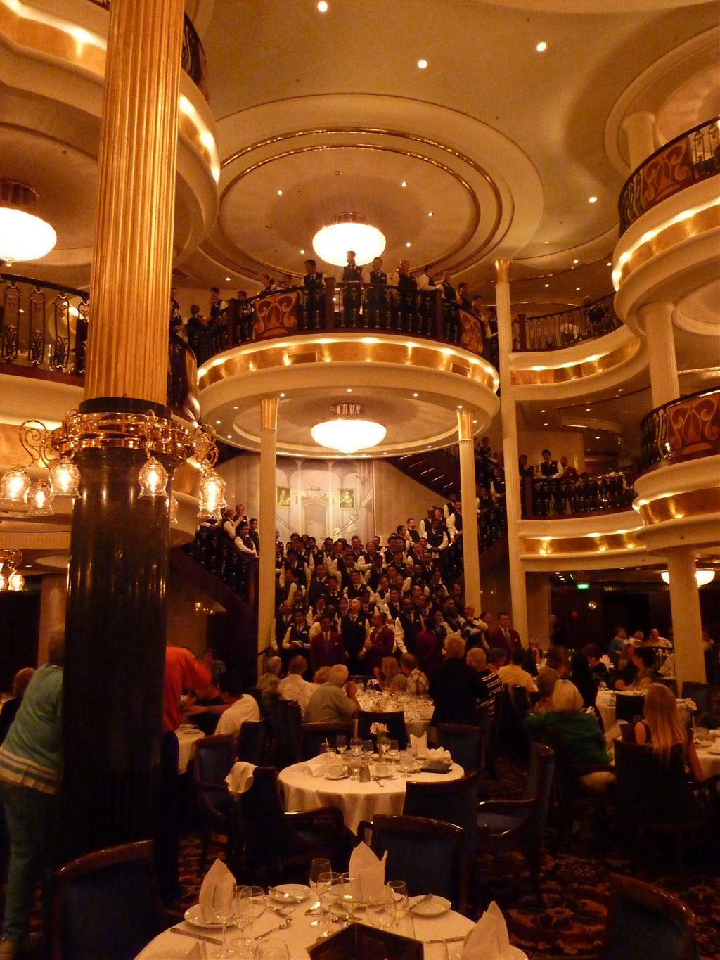 Am Nachmittag statten wir für fast eine Stunde dem grossen Fitness-Center einen Besuch ab. Danach galt es sich auf den ersten „Formal“-Abend vorzubereiten. Anzug und Krawatte für Dominik, Abendkleid für Daniela. Erfreulicherweise hat es nun auch mit dem „Main Seating“ geklappt und so konnten wir bereits um 18 Uhr in den dreistöckigen Speisesaal. Dort begrüssten wir unsere neuen Tischnachbarn; eine Familie aus Chicago und eine ältere Dame mit ihren 3 Töchtern aus Arizona und alle sind in einer Grande Suite untergebracht.