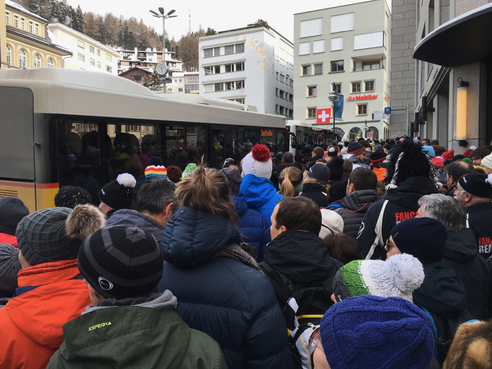 Es blieb gut 1 Stunde für die Verpflegung, was bei diesem Andrang etwas schwierig war. Um 13.30 Uhr starteten die Herren zu Ihrer Abfahrt. Und diesmal konnten wir über einen Schweizer Sieg jubeln. Beat Feuz stand ganz zuoberst. Nach dem Rennen genossen wir noch die Atmosphäre im Zielgelände und danach auch in St. Moritz. Wir statteten dem Kulmpark einen Besuch ab, kauften noch Fan-Artikel und ein paar Sandwiches für die Rückreise.
