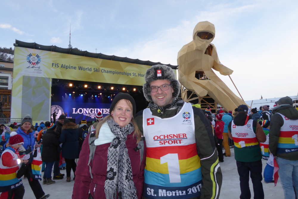 20. Februar 2017Am 12. Februar reisten wir nach St. Moritz zur Ski-WM. Das Wetterpech vom Samstag war unser Glück am Sonntag. Die abgesagte Abfahrt der Herren wurde nachgeholt. So kamen wir nach der Abfahrt der Damen gleich noch in den Genuss eines zweiten WM-Rennens. Doch zuerst mussten wir die 4-stündige Anreise hinter uns bringen. Danielas Mutter fuhr uns am Sonntagmorgen um 5.45 Uhr zum Bahnhof um den allerersten Zug nach Zürich zu erreichen. Um 10.15 Uhr waren wir dann zu Viert in St. Moritz angekommen. Danielas Schwester Anita und ihre Kollegin Karin waren ebenfalls mit dabei.