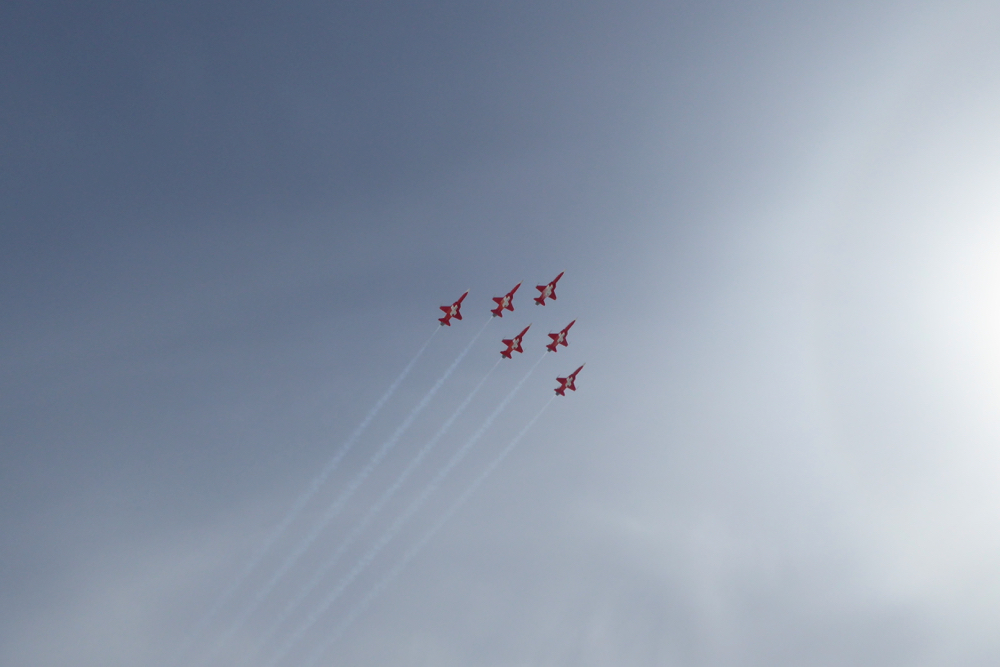 Wir machten uns zuerst etwas Sorgen, ob wir innert 1 Stunde vom Bahnhof zum Zielgelände gelangen konnten. Doch dank den vielen Postautos, die als Shuttle Busse fungierten, waren wir in gut 30min bereits oben. So konnten wir gerade noch einen Teil der Flugshow der Patrouille Suisse bestaunen. Danach suchten wir uns einen Platz auf der Tribüne und keine 10min später ging es schon los.