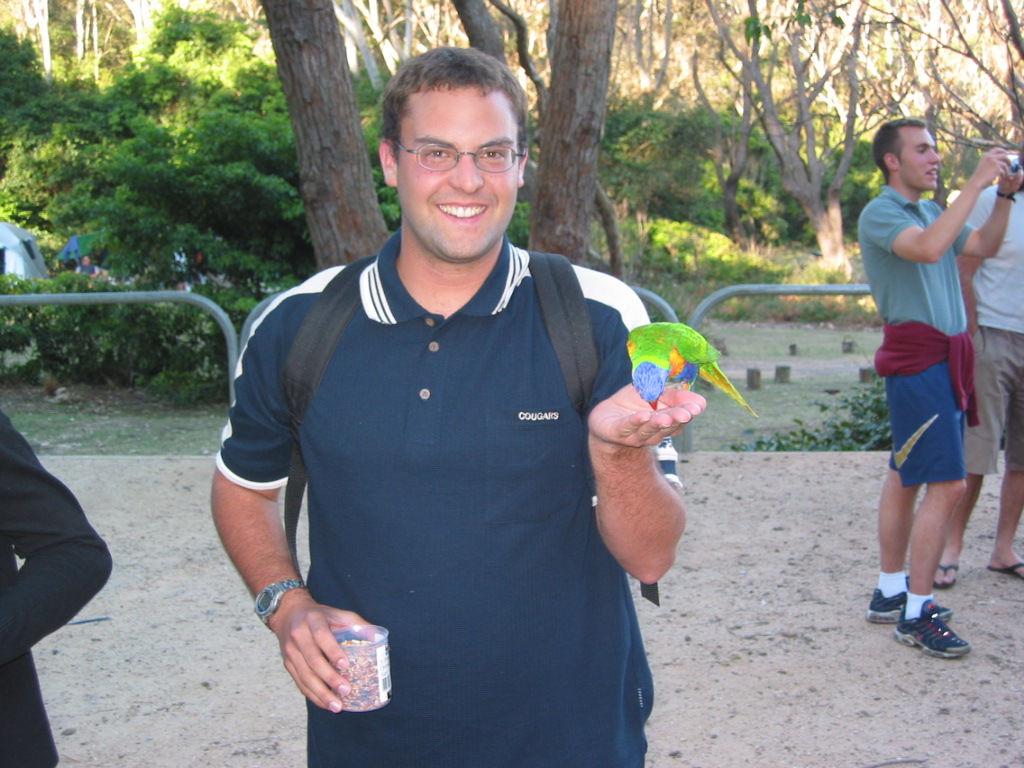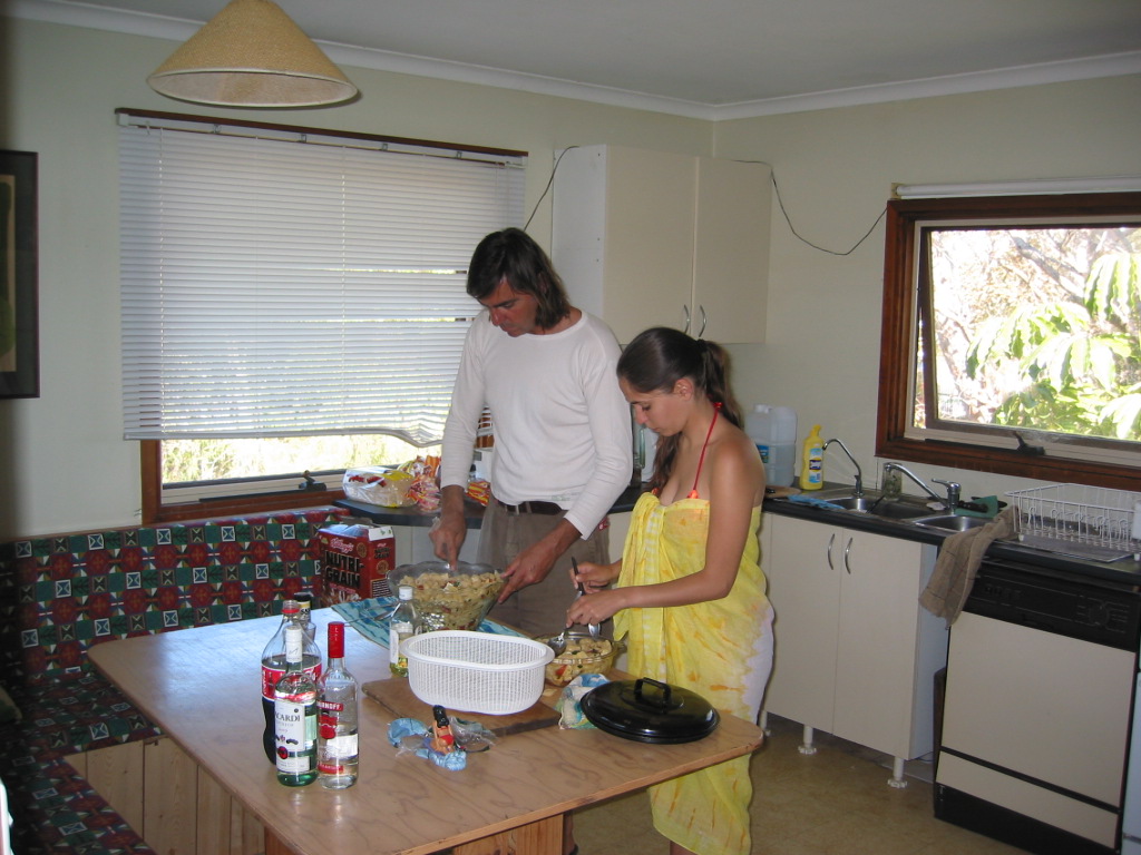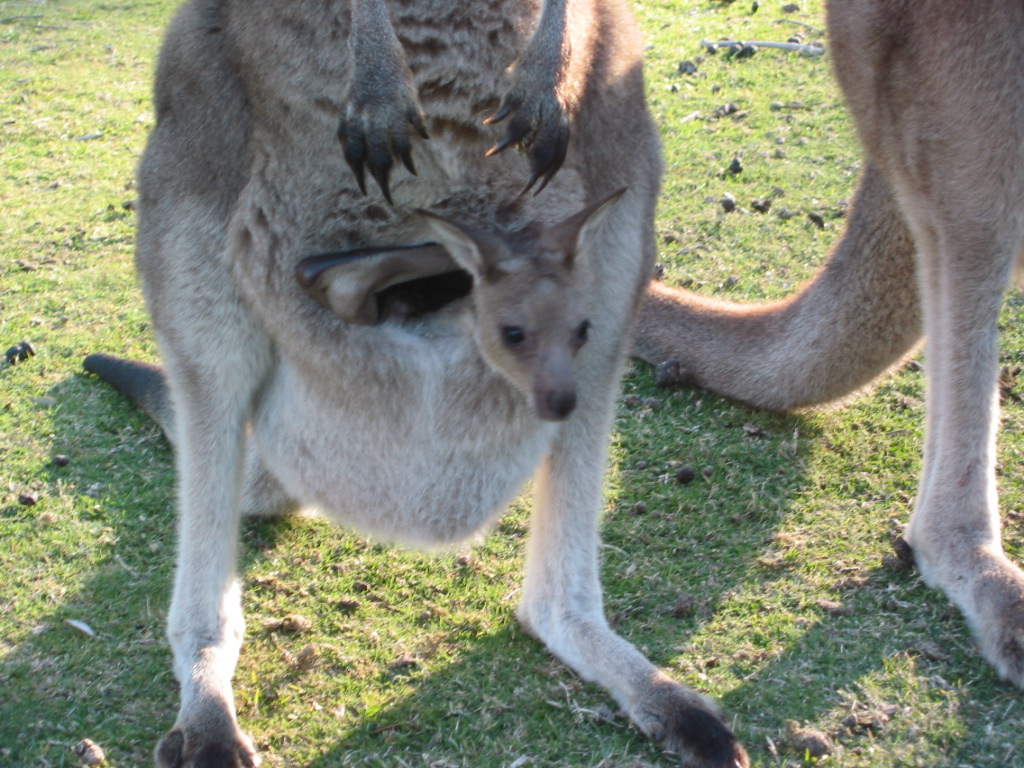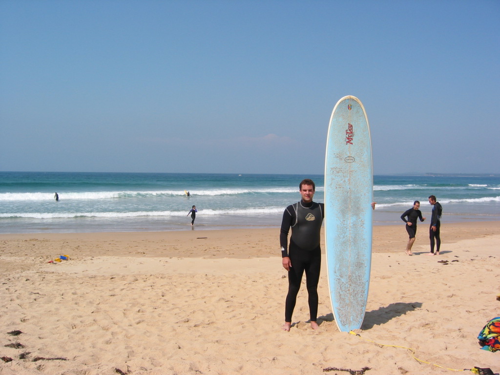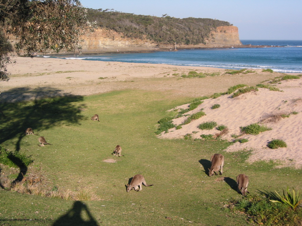 Untergebracht waren wir im Beach Haus von James, dem Organisator des Trips. Er stellte uns sein komplettes Haus inklusive Surf-Ausruestung zur Verfuegung. Am Samstagmorgen zogen alle ihren Neoprenanzug an und bekamen ein Surfboard unter den Arm. Nach einem 5-minuetigen Fussmarsch waren wir an einem Traumstrand: ungefaehr 10 Kilometer lang und fast menschenleer. Das Wasser war wie gewohnt nur etwa 16 Grad, aber mit dem Neoprenanzug kein Problem. Wir versuchten etwa 3 Stunden lang zu surfen und kamen zu einigen kleinen Erfolgen, aber so richtig klappen wollte es nicht. Am Nachmittag fuhren wir mit dem Minibus zur Pebbly Beach. Dort hat es einen Nationalpark, wo es jede Menge wilde Kangueruhs gibt. Diese konnte man fotografieren und sogar beruehren.