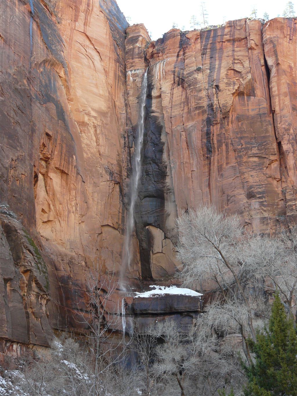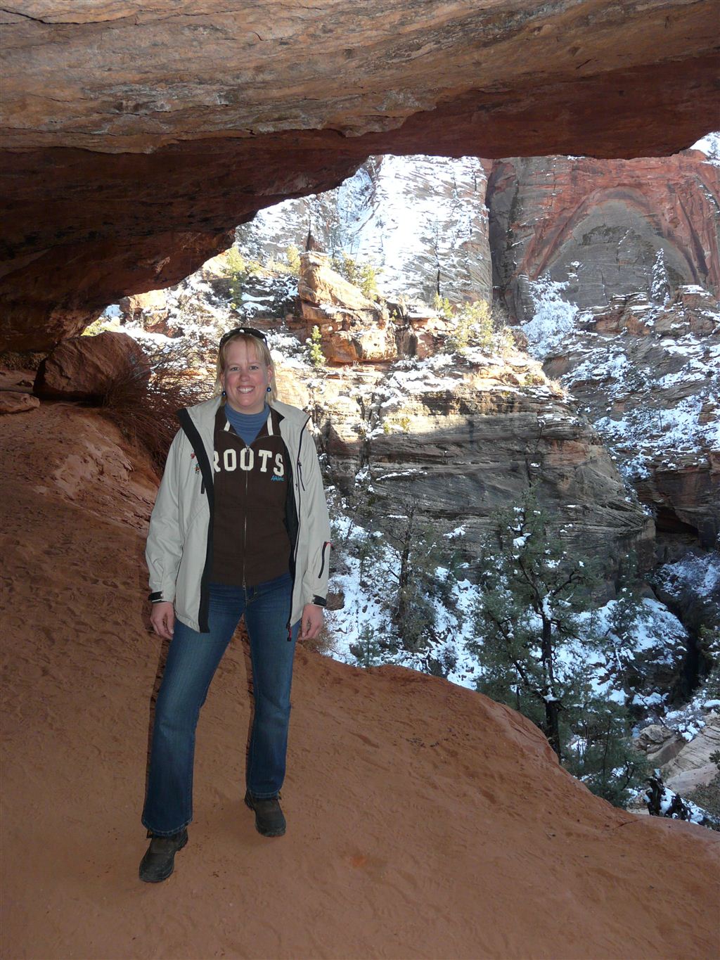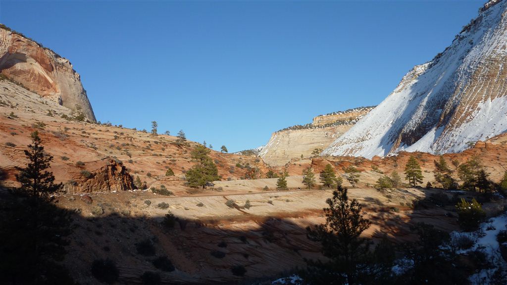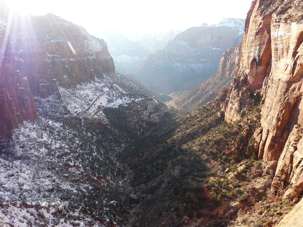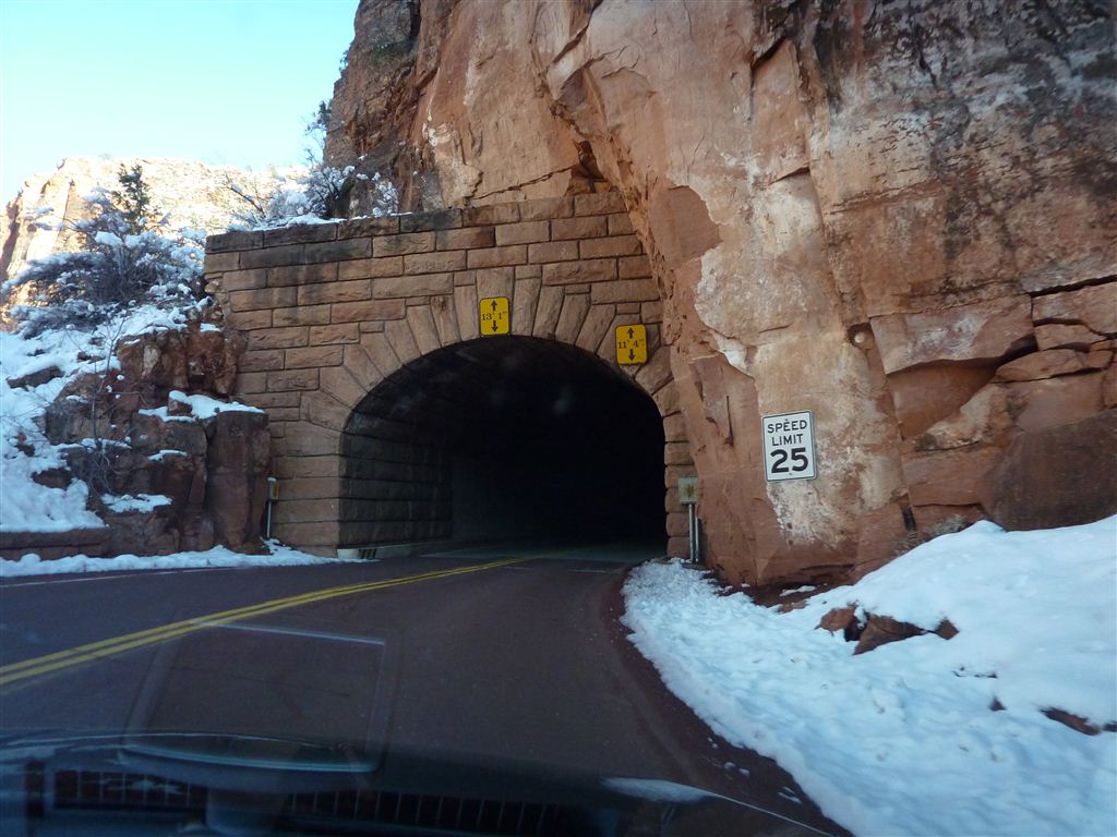 Wir entschieden uns, anstatt direkt zum Bryce Canyon durchzufahren, noch für einen Abstecher in den „Zion National Park“. Eine Strasse führte tief in die Schlucht hinein; links und rechts türmten sich hohe Felsen. Die Temperatur war merklich gesunken und bewegte sich nur noch um die 5 Grad. Da uns nun etwas die Zeit davonlief, gab es auf dem Parkplatz „Darvida“ und die noch übriggebliebenen M&Ms (siehe Las Vegas) zum Zmittag. Auf der gleichen Strasse ging es zurück und danach weiter nach oben.