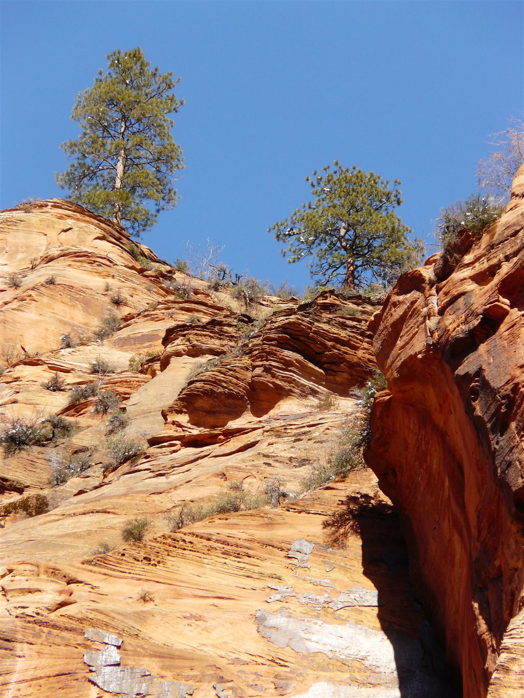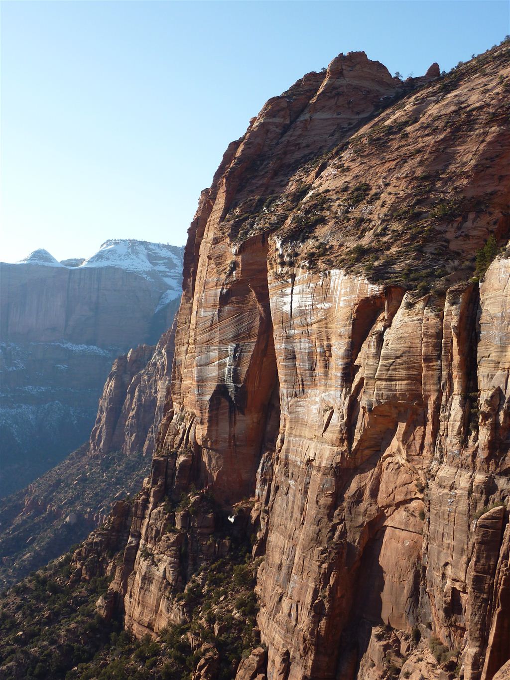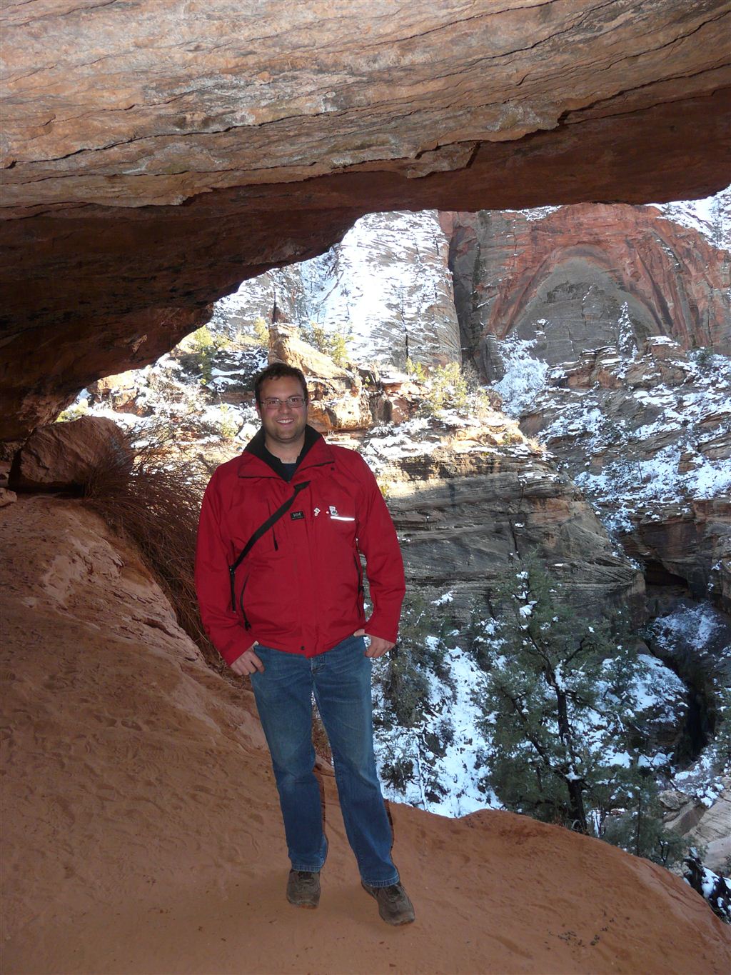Wir entschieden uns, anstatt direkt zum Bryce Canyon durchzufahren, noch für einen Abstecher in den „Zion National Park“. Eine Strasse führte tief in die Schlucht hinein; links und rechts türmten sich hohe Felsen. Die Temperatur war merklich gesunken und bewegte sich nur noch um die 5 Grad. Da uns nun etwas die Zeit davonlief, gab es auf dem Parkplatz „Darvida“ und die noch übriggebliebenen M&Ms (siehe Las Vegas) zum Zmittag. Auf der gleichen Strasse ging es zurück und danach weiter nach oben.